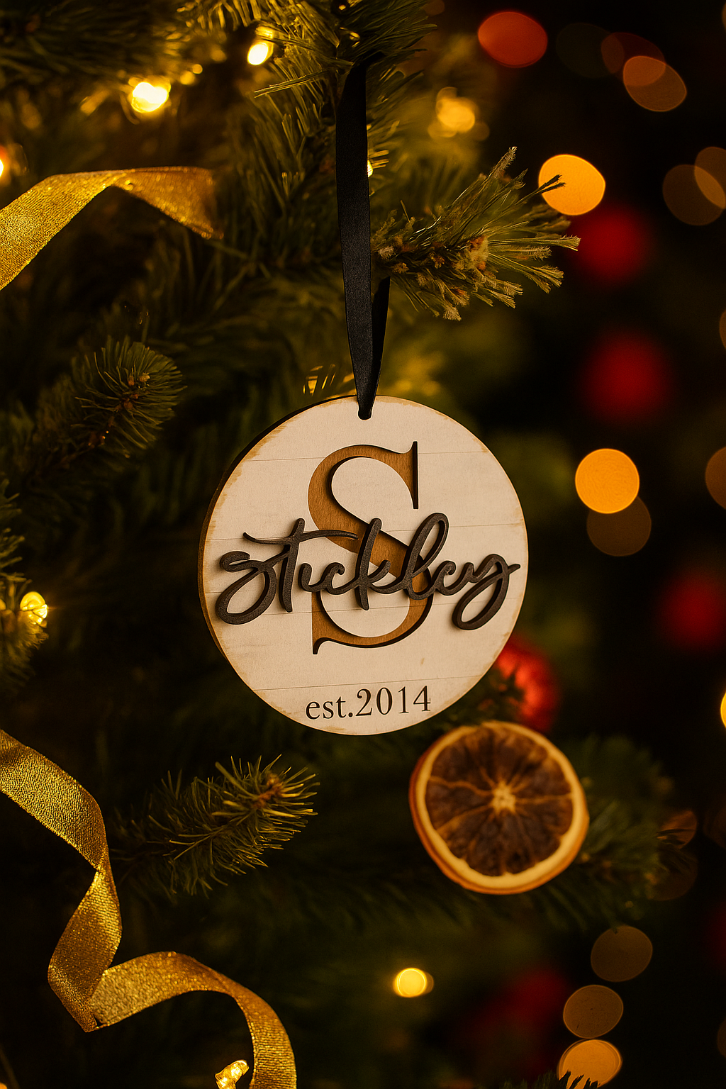 You have three things to select when choosing this ornament. Please select the correct letter of the alphabet you wish to use as the background letter. Use text field for the family name that is to go on the ornament. Please also add the year you want engraved on the bottom.