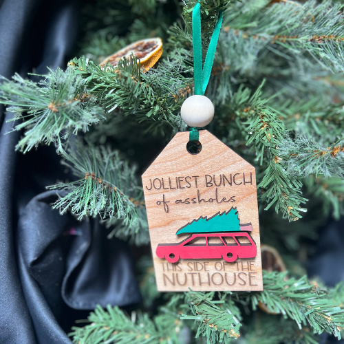 Add a touch of humor to your holiday decor with this playful "Jolliest Bunch of Assholes This Side of the Nuthouse" ornament. Perfect for gifting or keeping, it’s a funny way to celebrate festive gatherings with a cheeky nod to the family chaos everyone knows and loves. Durable and eye-catching, it’s sure to spark laughs and become a memorable part of your holiday traditions.